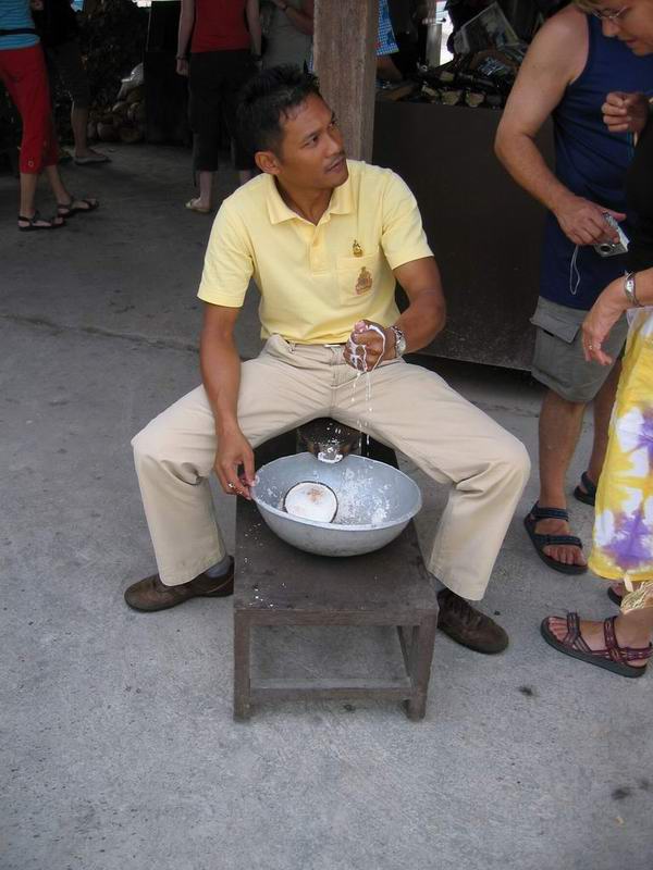 There’s two sides to the floating market at Damnoensaduak, the first is aimed primarily at tourists and is more expensive, the other is for the locals9 and has a lot of fresh produce including coconuts, pineapples, papaya and guava to name but a few. To get to the other side you have to battle your way through a small tunnel which is lined either side with yet more stalls –I’m sure this was done to trap the unsuspecting tourists. You’re grabbed from the left and right and offered all sorts of weird and wonderful items, I had to make Stacey go in front after an old woman with vice like grip got hold of her without me knowing.