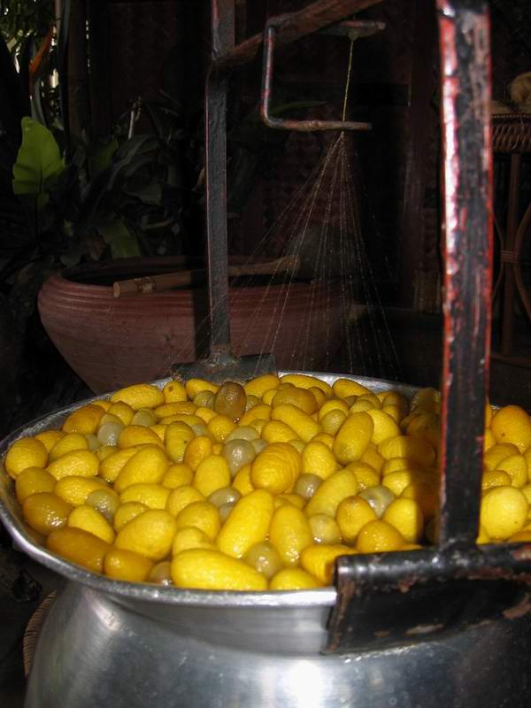 It’s an impressive setup, first they show you have the silk is produced using age-old techniques they boil the silk work cocoons1 which entices the work to put out the tiny thread of silk which is then wound together to make a single thread. If I remember/understood rightly the woman said each thread consists of 100 threads from the worms!