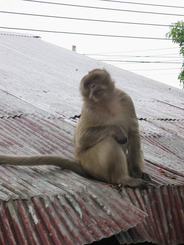 Feeling a little toyed with we wandered back down, only to be greeted by a monkey sitting on a tin roof4 and quickly realised that the monkeys gathered outside the local monkey feeding house. They’re curious creatures, and the likeness to humans is very obvious when you feed them. First we bought some bananas and the monkeys would take them gently5 and peel them –just like we do. If they wanted more than they had been given they would pull at your trouser leg until you offered another banana6.