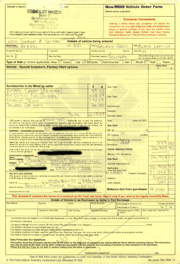 A few days later we confirmed that it was a new Coupe from Mazda called the RX-8 and so the obsession began. It's been less than two years (only just!) but this weekend I went and ordered it and for those of you who still don't beleive me, I've scanned in the receipt (with my name on it ;-))